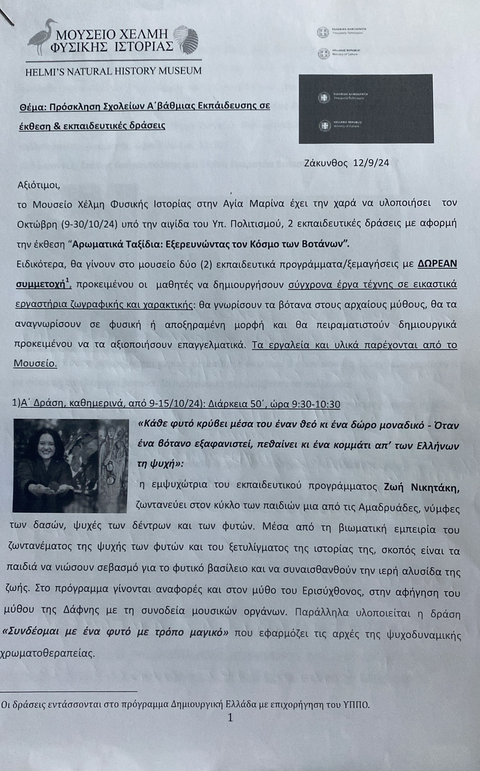 Κατόπιν συνεργασίας του Συλλόγου μας και του Προέδρου ΚΚΠΠΙΝ-ΟΔΑΖ, τα παιδιά του τμήματος επαγγελματικής κατάρτισης ΑμεΑ θα παρακολουθήσουν σεμινάρια στο μουσείο φυσικής ιστορίας “Χέλμη” με θέμα “Αρωματικά Ταξίδια: Εξερευνώντας τον Κόσμο των Βοτάνων”
